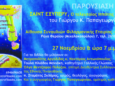 Την Τετάρτη 27 Νοεμβρίου στις 7 μ.μ. θα γίνη στην αίθουσα Συναυλιών της Φιλαρμονικής Εταιρίας Ρήγα Φεραίου (Μιχαλακοπούλου) 7 η παρουσίαση του βιβλίου του Γιώργου Παπαγεωργίου « ΣΑΙΝΤ ΕΞΥΠΕΡΥ, ο τελευταίος Ιππότης του ουρανού».