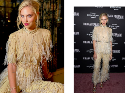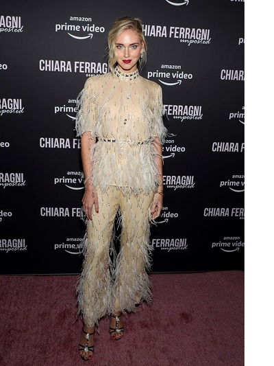 Κατέπληξε τους θαυμαστές της στη Νέα Υόρκη η blogger - επιχειρηματίας και fashion icon Κιάρα Φεράνι στην πρεμιέρα του ντοκιμαντέρ για τη ζωή της "Chiara Ferragni Unpρessed". Η 31χρονη πάμπλουτη ιταλίδα, της οποίας οι ακόλουθοι στο Instagram έχουν ξεπεράσει τα 17 εκατομμύρια, περπάτησε στο κόκκινο χαλί με ένα αχνοκίτρινο σύνολο - τοπ και παντελόνι- του αγαοημένου της ιταλικού label Prada κεντημένο με φτερά, κρυστάλλινες πέτρες και παγιέτες. Τα μαλλιά της ήταν πιο ξανθά από ποτέ και το κραγιόν της γιορτινό, κατακόκκινο. Tα αμερικάνικα media χαρακτήρισαν το ντύσιμό της συναρπαστικό και λαμπερό. Και δικαιολογημένα!