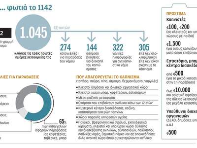 Στην πλειονότητά τους (σε ποσοστό μεγαλύτερο του 65%) αυτές οι παραβάσεις αφορούσαν σε καταστήματα υγειονομικού ενδιαφέροντος, καφέ, μπαρ-καφέ και ταβέρνες, κατά βάση από πελάτες αλλά σε κάποιες περιπτώσεις και από εργαζομένους, και ακολουθούν σε συχνότητα οι ιδιωτικές επιχειρήσεις (15%) και οι δημόσιες υπηρεσίες (5%).