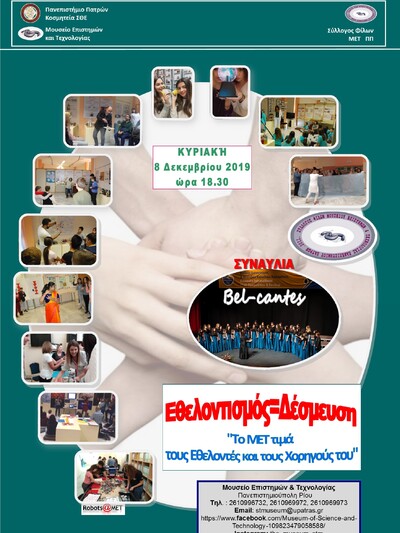 Την Κυριακή 8 Δεκεμβρίου 2019, στις 18.30, το Μουσείο Επιστημών και Τεχνολογίας του Πανεπιστημίου Πατρών (ΜΕΤ), η Κοσμητεία της Σχολής Θετικών Επιστημών ΠΠ και ο Σύλλογος Φίλων ΜΕΤ, διοργανώνουν στον χώρο του ΜΕΤ την εκδήλωση «Εθελοντισμός=Δέσμευση, το ΜΕΤ τιμά τους εθελοντές και τους χορηγούς του».
