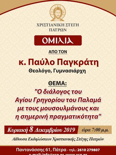 Εκδήλωση - διάλεξη του Θεολόγου –Γυμνασιάρχη κ. Παύλου Παγκράτη με θέμα "Ο διάλογος του Αγίου Γρηγορίου του Παλαμά με τους μουσουλμάνους και η σημερινή πραγματικότητα" προγραμματίζεται γι’ αυτή την Κυριακή 8 Δεκεμβρίου 2019 στις 7 το απόγευμα στην κεντρική αίθουσα εκδηλώσεων της Χριστιανικής Στέγης Πατρών.
