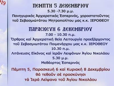 Ο κ.κ. Ιερόθεος θα προεξάρχει και το πρωί της Παρασκευής 6/12/2019 στην αρχιερατική Θεία λειτουργία ενώ θα ακολουθήσει στις 10.30 η λιτάνευση της εικόνας και των ιερών λειψάνων του Αγίου Νικολάου. Στις 5.30 το απόγευμα θα τελεστεί μεθεόρτιος εσπερινός.