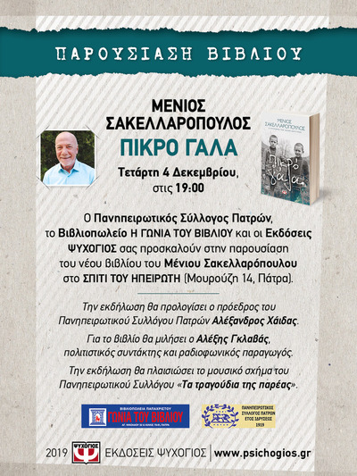 Απόψε Τετάρτη 4 Δεκεμβρίου 2019, όπως έχουμε γράψει παρουσιάζεται σε εκδήλωση το νέο βιβλίο του δημοσιογράφου και συγγραφέα Μένιου Σακελλαρόπουλου με τίτλο "Πικρό Γάλα" που κυκλοφορεί από τις εκδόσεις Ψυχογιός. Η εκδήλωση πραγματοποιείται από το βιβλιοπωλείο «Η Γωνιά του Βιβλίου» της οικογένειας Παπαχρίστου στις 7 το απόγευμα, στο «Σπίτι του Ηπειρώτη» στην οδό Μουρούζη 14-16, 1ος όροφος, πλησίον της Καρόλου.