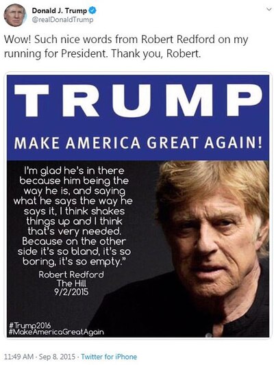 Στη φωτ. παλιότερο μήνυμα του ηθοποιού Ρόμπερτ Ρέντφορντ για τον Τραμπ το 2016 που είχε χαροποιήσει τον Τραμπ. Όπως είπε ο Ρέντφορντ του έδωσε αρχικά μία ευκαιρία αλλά η εξέλιξη της πολιτικής Τραμπ τον απογοήτευσε οικτρά και τον θύμωσε και πλέον παροτρύνει τους συμπατριώτες του Αμερικανούς να ψηφίσουν διαφορετικά στις Προεδρικές εκλογές το Νοέμβριο του 2020.