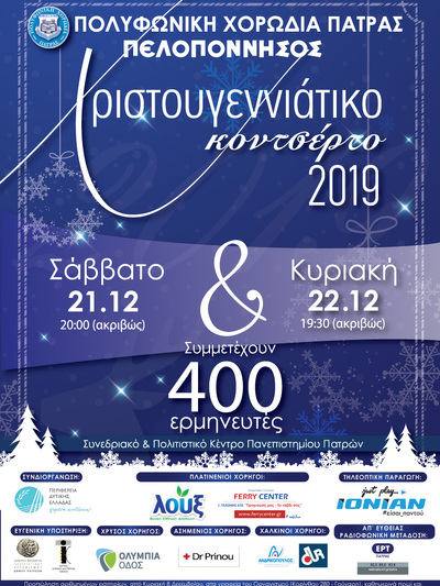 Στο τελικό στάδιο βρίσκονται οι προετοιμασίες για το φετινό Χριστουγεννιάτικο Κοντσέρτο που οργανώνουν από κοινού η Πολυφωνική Χορωδία Πάτρας και η Εφημερίδα ‘’Πελοπόννησος’’. Το κοντσέρτο – θεσμός θα πραγματοποιηθεί στο Συνεδριακό και Πολιτιστικό Κέντρο του Πανεπιστημίου Πατρών το Σάββατο και την Κυριακή 21 και 22 Δεκεμβρίου στις 8 μ.μ. και 7.30 μ.μ. αντιστοίχως: ακριβώς!