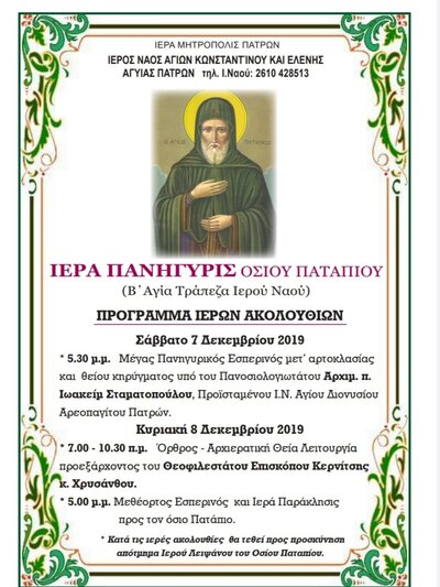 Θρησκευτική πανήγυρη όπου θα τιμηθεί η μνήμη του Οσίου Παταπίου θα γίνει στις 7 και 8 Δεκεμβρίου 2019 και στην Πάτρα. Στον ιερό ναό Αγίων Κωνσταντίνου και Ελένης Αγυιάς Πατρών είναι αφιερωμένη στον Όσιο Πατάπιο η β’ Αγία Τράπεζα του ναού έτσι διοργανώνεται ο εν λόγω εορτασμός που θα ξεκινήσει το Σάββατο 7/12 στις 5.30 το απόγευμα με τον εσπερινό μετ’ αρτοκλασίας όπου θα ιερουργήσει και θα κηρύξει το Θείο λόγο ο αρχιμανδρίτης Ιωακείμ Σταματόπουλος από το ναό Αγ. Διονυσίου Αρεοπαγίτη Πατρών. Το πρωί της Κυριακής 8/12/2019 στην πανηγυρική Θεία λειτουργία θα χοροστατήσει και θα μιλήσει ο Επίσκοπος Κερνίτσης κ. Χρύσανθος. Στις 5 το απόγευμα θα τελεστεί μεθεόρτιος εσπερινός και παράκληση στον Όσιο Πατάπιο. Στο ναό θα υπάρχει απότμημα από το ιερό λείψανο του Οσίου για να το προσκυνήσουν οι πιστοί. Να θυμίσουμε πως στην περιοχή του Λουτρακίου υπάρχει μοναστήρι αφιερωμένο στον Όσιο Πατάπιο.