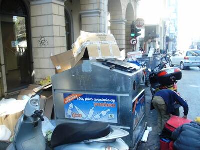 Το φαινόμενο είναι καθημερινό και «κορυφώνεται» κυρίως κατά τις μεσημεριανές ώρες, όταν δηλαδή τα πέριξ καταστήματα βγάζουν τα απορρίμματά τους και τα χαρτοκιβώτια για τα πάρουν τα συνεργεία του Δήμου. Βέβαια, οι κάδοι που υπάρχουν στο σημείο δεν επαρκούν και ξεχειλίζουν με αποτέλεσμα τα απορρίμματα να πέφτουν στο πεζοδρόμιο.