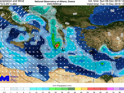 Στον προγνωστικό χάρτη, του meteo.gr, που ακολουθεί απεικονίζεται το βαρομετρικό χαμηλό που θα προξενήσει την κακοκαιρία "Διδώ" και τα φαινόμενα που θα εκδηλώνονται τις μεσημεριανές ώρες της Τρίτης 10/12.