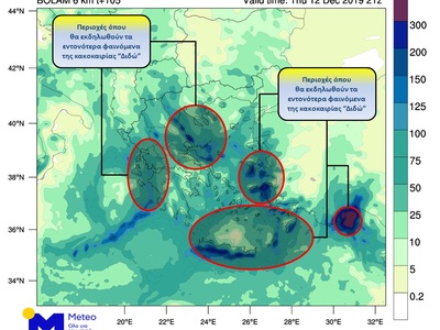 Τα φαινόμενα που θα συνοδεύουν τη "Διδώ" κατά το διήμερο Τρίτη 10/12 - Τετάρτη 11/12 θα είναι οι κατά τόπους ισχυρές βροχοπτώσεις και καταιγίδες, οι πυκνές χιονοπτώσεις στα ορεινά και οι τοπικά θυελλώδεις άνεμοι.
