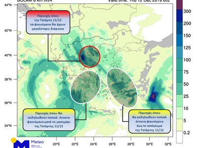 Στον προγνωστικό χάρτη που ακολουθεί παρουσιάζονται οι αθροιστικές ποσότητες υετού (βροχές / καταιγίδες / χιονοπτώσεις) της "Διδούς", έως τις βραδινές ώρες της Τετάρτης 11/12.