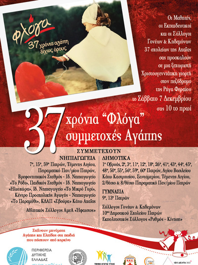 Την Κυριακή 15 Δεκεμβρίου 2019, στις 10 το πρωί, οι μαθητές, οι εκπαιδευτικοί, οι Σύλλογοι Γονέων και Κηδεμόνων 37 σχολείων της Αχαΐας και το Παράρτημα Ν. Αχαΐας του Συλλόγου Γονιών Παιδιών με Νεοπλασματική Ασθένεια «Φλόγα» προσκαλούν το κοινό σε μια ξεχωριστή Χριστουγεννιάτικη γιορτή στον πεζόδρομο της Ρήγα Φεραίου όπου και θα στείλουν μηνύματα Αγάπης και Ελπίδας στα παιδιά που πάσχουν από Καρκίνο.