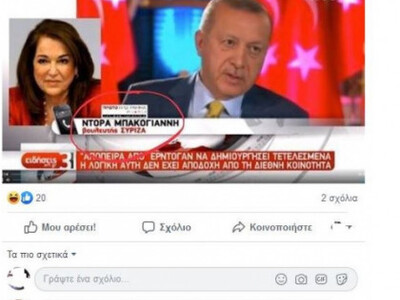 Η βουλευτής Β' Πειραιά σχολίασε κάτω από ένα screenshot από το δελτίο της ΕΡΤ στο οποίο λανθασμένα είχε γραφτεί πως η Ντόρα Μπακογιάννη είναι βουλευτής του ΣΥΡΙΖΑ, και έγραψε: «Η διεύρυνση γκαζώνει, μπάτσοι - γουρούνια - δολοφόνοι».