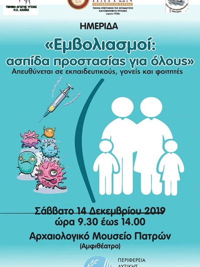Το Τμήμα Επιστημών της Εκπαίδευσης και Κοινωνικής Εργασίας (πρώην ΠΤΔΕ) του Πανεπιστημίου Πατρών, στο πλαίσιο της Αγωγής Υγείας και σε συνεργασία με την Περιφερειακή Διεύθυνση ΠΕ και ΔΕ Δυτικής Ελλάδας - Διεύθυνση Πρωτοβάθμιας Εκπαίδευσης Αχαΐας/Αγωγή Υγείας και Διεύθυνση Δευτεροβάθμιας Εκπαίδευσης Αχαΐας/Αγωγή Υγείας, συνδιοργανώνουν Ημερίδα με τίτλο: «Εμβολιασμοί: ασπίδα προστασίας για όλους» που απευθύνεται σε εκπαιδευτικούς, γονείς και φοιτητές.