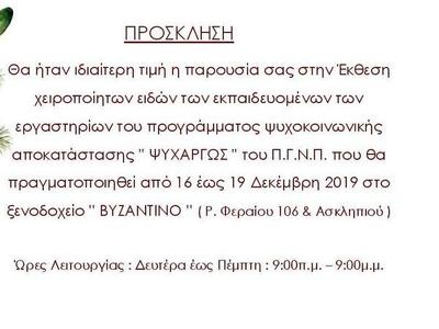Στο πλαίσιο αυτής της συνεργασίας διοργανώνεται Χριστουγεννιάτικη έκθεση κοινωνικού χαρακτήρα, με εκθέματα που έχουν φιλοτεχνηθεί από τους εκπαιδευόμενους. Θα φιλοξενηθεί στο ξενοδοχείο Βυζαντινό στην Πάτρα το χρονικό διάστημα, από τις 16 έως 19 Δεκεμβρίου 2019.