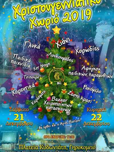 Όπως κάθε χρόνο, έτσι και φέτος θα στηθεί το ετήσιο "Χριστουγεννιάτικο Χωριό" του Μορφωτικού & Πολιτιστικού Συλλόγου "Παναγία η Γηροκομήτισσα". Οι προγραμματισμένες εκδηλώσεις του θα πραγματοποιηθούν την Σάββατο 21/12 & την Κυριακή 22/12/2019 από τις 17.30 το απόγευμα και μετά στην πλατεία Κυδωνιάτη- Γηροκομειό, στην Πάτρα.