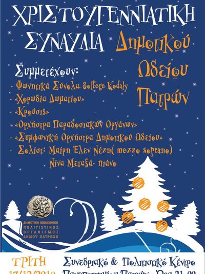 Μία ξεχωριστή νότα, στις Χριστουγεννιάτικες εκδηλώσεις με τίτλο «Χριστούγεννα είναι…» , που διοργανώνει ο Πολιτιστικός Οργανισμός του Δήμου Πατρέων, αναμένεται να δώσουν στις 9.00 το βράδυ της Τρίτης (απόψε) 17 Δεκεμβρίου, τα σύνολα του Δημοτικού Ωδείου Πατρών, τα οποία συμμετέχουν στην ετήσια Χριστουγεννιάτικη Συναυλία του Ωδείου.