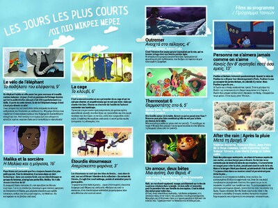 Θα προβληθούν 9 γαλλικές και γαλλόφωνες ταινίες (8 ταινίες κινουμένων σχεδίων και 1 μυθοπλασίας) για παιδιά ηλικίας από 8 έως 10 ετών.
