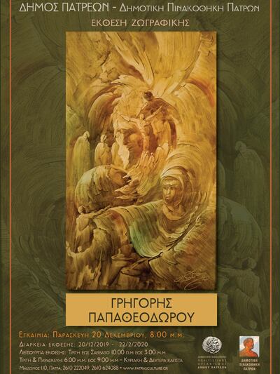 Τα εγκαίνια της έκθεσης ζωγραφικής με έργα του Γρηγόρη Παπαθεοδώρου, πραγματοποιούνται την Παρασκευή (αύριο) 20 Δεκεμβρίου, στις 8.00 το βράδυ στη Δημοτική Πινακοθήκη Πατρών. Η έκθεση θα φιλοξενείται έως το Σάββατο 22 Φεβρουαρίου 2020 και είναι μία παραγωγή της Δημοτικής Πινακοθήκης, με την οποία θα κλείσει μία σημαντικότατη σε περιεχόμενο χρονιά.