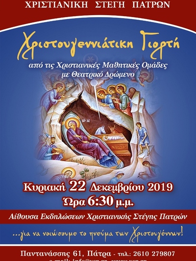 H ετήσια Χριστουγεννιάτικη Γιορτή της Χριστιανικής Στέγης Πατρών θα λάβει χώρα την Κυριακή 22 Δεκεμβρίου 2019 και ώρα 6.30 μ.μ. στην κεντρική αίθουσα ομιλιών της Χριστιανικής Στέγης Πατρών, Παντανάσσης 61.