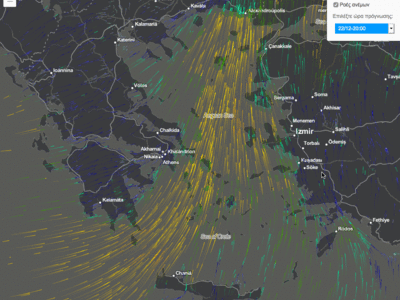 τιγμιότυπο από τις εκτιμώμενες εντάσεις και διευθύνσεις των ανέμων για τις βραδινές ώρες της Κυριακής 22/12/2019.