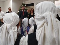 Η μέρα ξεκίνησε με κάλαντα από την Πελοπόννησο που τραγούδησαν παιδιά με παραδοσιακές φορεσιές από το Λύκειο των Ελληνίδων Πάτρας. Την αντιπροσωπεία συνόδευε η πρόεδρος Κατερίνα Πολυκρέτη και άλλα μέλη του ΔΣ.