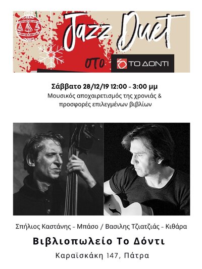 Κάθε χρόνο παραμονές Πρωτοχρονιάς, οι εκδόσεις – βιβλιοπωλείο «Το Δόντι» του Ανδρέα Τσιλίρα, γιορτάζουν με μουσική, κεράσματα και προσφορές. Έτσι και φέτος, το Σάββατο 28 Δεκεμβρίου 2019 από τις 12 το μεσημέρι, το βιβλιοπωλείο που πλέον στεγάζεται στην οδό Καραϊσκάκη 147, δίπλα στο θέατρο «Αγορά», στην Πάτρα, αναμένεται να μετατραπεί σε τζαζ στέκι με τους Σπήλιο Καστάνη (μπάσο) και Βασίλη Τζιατζιά (κιθάρα) σ’ ένα γιορτινό μουσικό live ενώ ειδικά για αυτή τη μέρα θα υπάρχουν προσφορές σε επιλεγμένα βιβλία.