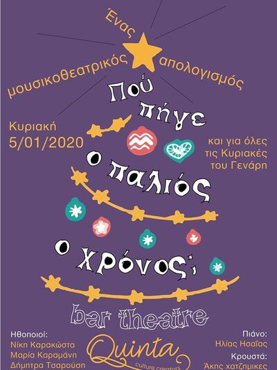Μία μουσικοθεατρική παράσταση με τίτλο «Πού πήγε ο παλιός ο χρόνος» θα παρουσιαστεί στο Επίκεντρο+ στην Aγίου Διονυσίου 36 & Νόρμαν στην Πάτρα, την Κυριακή 5 Ιανουαρίου 2020 στις 22.00 το βράδυ και θα επαναληφθεί και όλες τις Κυριακές του Γενάρη.