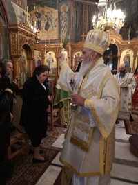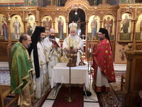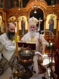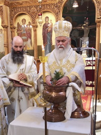 Εκεί ετέλεσε την Θεία Λειτουργία και αμέσως μετά, την ακολουθία του Μεγάλου Αγιασμού. Στη σύντομη προσλαλιά του προς τους παρευρισκομένους πιστούς διά την λαμπρή εορτή των Θεοφανείων, υπογράμμισε ότι σήμερα αγιάζονται τα ύδατα, ο άνθρωπος αλλά και ολόκληρη η φύση. Το ύδωρ του αγασμού είναι το «ύδωρ της αναγεννήσεως», το οποίο διά της επικλήσεως και επιφοιτήσεως του αγίου Πνεύματος μεταστοιχειούται και γίνεται «αφθαρσίας πηγή, αγιασμού δώρον, αμαρτημάτων λυτήριον, νοσημάτων αλεξιτήριον» για όλους εμας που μεταλαμβάνουμε ή χριόμεθα με αυτό. Ευχήθηκε το φως του Χριστού, που μεταλαμπαδεύεται στις καρδιές μας, διά της εορτής των Φώτων, να φωλιάσει στις ψυχές μας, να μπει στις οικογένειές μας, στην κοινωνία μας, σε ολόκληρο τον κόσμο, για να ειρηνεύσει ο κόσμος, διότι η έλευση του Χριστού σκοπό έχει να ενώσει τους ανθρώπους και να καταλαγιάσει τα μίση και τις κακίες. Ο δε Κύριός μας Ιησούς Χριστός να σκεπάζει και να ευλογεί τη ζωή όλων. Τέλος, ανήγγειλε την έναρξη από τον ίδιο καθημερινής Θείας Λειτουργίας στον Ιερό Ναό της Αγίας Τριάδας από την Δευτέρα 13 Ιανουαρίου και κάλεσε τους πιστούς με την πίστη τους και την αγάπη τους στο Θεό να πλαισιώσουν διά της ενεργού συμμετοχής τους αυτή την λατρευτική, προσευχητική προσπάθεια.