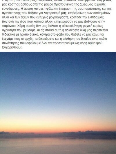 "Η αγάπη των δικών μας ανθρώπων, φίλων, γειτόνων, συνεργατών, συγγενών, μας κράτησε όρθιους στα πιο μαύρα Χριστούγεννα της ζωής μας. Είμαστε ευγνώμονες. Η άμεση και ανεπιφύλακτη έκφραση της συμπαράστασης και της αγανάκτησης που δείξατε για λογαριασμό μας, επιβεβαίωση των αισθημάτων αλλά και των αξιών που ευτυχώς μοιραζόμαστε, κράτησε την ελπίδα μας ζωντανή την ώρα που κάποιοι άλλοι, επιχειρούσαν να μας βυθίσουν στην παράνοια. Χάρη σ’εσάς δεν μας διέλυσε η αδικαιολόγητη ψυχική κυρίως αγριότητα που βιώσαμε. Κι ας σταθεί αυτή η αδιανόητη δική μας περιπέτεια διδακτική με τρόπο θετικό, κόντρα στο φόβο που θάθελε να μας κάνει να ξεχνάμε πως οι αρχές, τα δικαιώματα και η αίσθηση του δικαίου είναι πεδίο συνάντησης που οφείλουμε όλοι να προστατεύουμε ως κόρη οφθαλμού. Ευχαριστούμε.