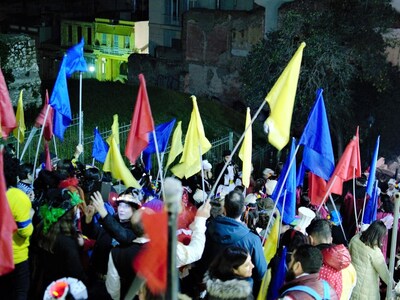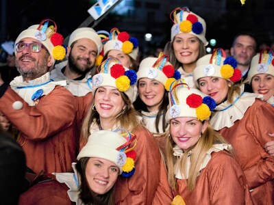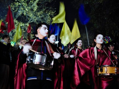 Μετά το τέλος της δοκιμασίας όλοι οι συγκεντρωμένοι με λάβαρα στα χρώματα του Πατρινού Καρναβαλιού συνάντησαν την ομάδα κρουστών και κατευθύνθηκαν στην πλατεία Γεωργίου προκειμένου να παρακολουθήσουν την Τελετή Έναρξης.