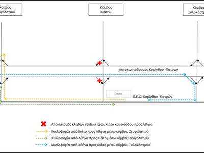 Η κυκλοφορία για το διάστημα αυτό θα εξυπηρετείται μέσω της Π.Ε.Ο. Αθηνών-Κορίνθου και των γειτονικών Κόμβων Ξυλοκάστρου (Χ.Θ. 119,4) και Ζευγολατιού (Χ.Θ. 95,0), όπως φαίνεται στο ακόλουθο σχηματικό διάγραμμα.