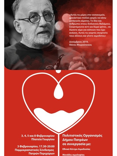 *Στις 3, 4, 5 και 8 Φεβρουαρίου η εθελοντική αιμοδοσία στη μνήμη του Θάνου Μικρούτσικου θα λάβει χώρα στην πλατεία Γεωργίου, ενώ τη Δευτέρα 3/2 στις 17.30 με 20.00 στον Παμμικρασιατικό σύνδεσμο Πατρών και Περιχώρων στην οδό Φωκαίας και τέλος την Τρίτη 4/2, 10 το πρωί με 1 το μεσημέρι στο κτίριο της Πρυτανείας του Πανεπιστημίου Πατρών.
