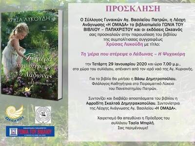 Απόψε Τετάρτη 29/1/2020 μετά τις 19.00 πραγματοποιείται η παρουσίαση του βιβλίου, «Τη 'μέρα που στέρεψε ο Λάδωνας» της συγγραφέως Χρύσας Λυκούδη στον χώρο του Συλλόγου Γυναικών Αγίου Βασιλείου Πατρών, απέναντι από τον ιερό ναό της Αγ. Κυριακής.