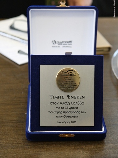 Η συγκίνηση όλων των παρευρισκομένων ήταν μεγάλη όταν ο Πρόεδρος του Συλλόγου Γιώργος Ζεππάτος ανακοίνωσε την ομόφωνη απόφαση του Δ.Σ. του Συλλόγου και τη συνηγορία της καλλιτεχνικής διευθύντριας της Ορχήστρας να τιμηθεί για τη συνεχή, μοναδική, ανιδιοτελή και υποδειγματική προσφορά του στην Ορχήστρα ο κ. Αλέξης Καλύβας που είναι το μοναδικό μέλος της Ορχήστρας που συμμετέχει ενεργά από την πρώτη ημέρα της ίδρυσής της μέχρι σήμερα.