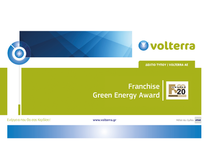 Η Volterra (Παραγωγός και Πάροχος Ενέργειας), μέλος του κατασκευαστικού ομίλου AVAX, με ιδιαίτερη χαρά ανακοινώνει τη βράβευσή του δικτύου των φυσικών καταστημάτων Franchise -Volterra Shop- με το βραβείο «Franchise Green Energy Award», στη διαδικασία αξιολόγησης των βραβείων «Franchise 2020», τα οποία φέτος συμπληρώνουν τον δωδέκατο έτος διοργάνωσής τους και υλοποιήθηκαν την Τετάρτη 29 Ιανουαρίου, στο Gazarte.