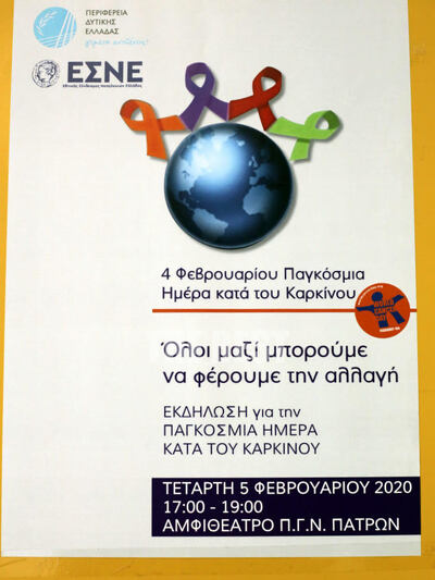 Εκδήλωση στο πλαίσιο της παγκόσμιας ημέρας κατά του καρκίνου πραγματοποιήθηκε την Τετάρτη 5 Φεβρουαρίου στις 5 το απόγευμα στο Πανεπιστημιακό Νοσοκομείο της Πάτρας. Στη διάρκειά της παρουσιάστηκε ο οδηγός εκπαίδευσης ασθενών που λαμβάνουν χημειοθεραπεία και θα διατεθεί στους διευθυντές των δύο ογκολογικών μονάδων της περιοχής, προς διανομή στους χημειοθεραπευόμενους ασθενείς.