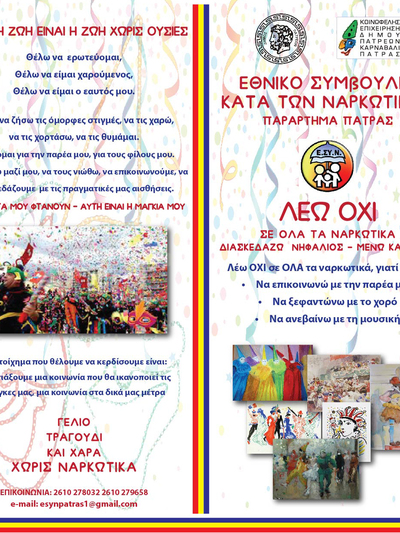 Τη συμπόρευσή τους και τον αγώνα τους εναντίον της μάστιγας των Ναρκωτικών αποδεικνύουν με τη συνεργασία τους η Κοινωφελής Επιχείρηση του Δήμου Πατρέων – Καρναβάλι Πάτρας και το Εθνικό Συμβούλιο κατά των Ναρκωτικών (Ε.ΣΥ.Ν.) – παράρτημα Πάτρας κατά τη διάρκεια της καρναβαλικής περιόδου. Στο πλαίσιο αυτό εξέδωσαν ενημερωτικό φυλλάδιο (flyer), που θα διανεμηθεί σε μαθητές και μαθήτριες και προτρέπει «να φτιάξουμε μια κοινωνία που θα ικανοποιεί τις ανάγκες μας, μια κοινωνία στα δικά μας μέτρα. Γέλιο, τραγούδι και χαρά χωρίς Ναρκωτικά».