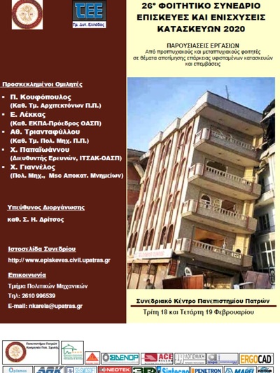 Το διήμερο 18 και 19 Φεβρουαρίου 2020 θα πραγματοποιηθεί στο Συνεδριακό και Πολιτιστικό Κέντρο του Πανεπιστημίου Πατρών στο Ρίο, το 26ο Φοιτητικό Συνέδριο με τίτλο: «Επισκευές και ενισχύσεις κατασκευών 2020». Η θεματολογία του Συνεδρίου καλύπτει όλους τους τομείς σε θέματα αποτίμησης επάρκειας υφισταμένων κατασκευών και επεμβάσεις, ανεξαρτήτως υλικού και διοργανώνεται από το Πανεπιστήμιο Πατρών και το Τ.Ε.Ε./Τμήμα Δυτικής Ελλάδος.