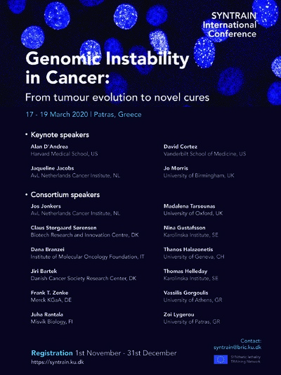 Στο μεταξύ το Διεθνές Συνέδριο με τίτλο: Γονιδιωματική Αστάθεια στον Καρκίνο: από την εξέλιξη του καρκίνου σε νέες θεραπείες», το οποίο διοργανώνεται από το ευρωπαϊκό δίκτυο SYNTRAIN θα πραγματοποιηθεί στα μέσα Μαρτίου και πιο συγκεκριμένα, από τις 17 έως 19 Μαρτίου 2020 στο Συνεδριακό και Πολιτιστικό Κέντρο του Πανεπιστημίου Πατρών στο Ρίο. Τα μέλη και οι φοιτητές του Πανεπιστημίου Πατρών μπορούν να συμμετάσχουν ενεργά στο συνέδριο, αναδεικνύοντας τις σχετικές δραστηριότητες του Πανεπιστημίου Πατρών. Για να διευκολυνθεί η συμμετοχή Ελλήνων επιστημόνων, δημιουργήθηκε ειδική κατηγορία Local κατά την εγγραφή, που δίνει τη δυνατότητα ελεύθερης πρόσβασης στο επιστημονικό μέρος του συνεδρίου.