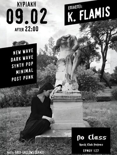Στο νέο ροκ κλαμπ της πόλης, το No Class, στο πάνω μέρος της οδού Ερμού, θα παίξει μουσική ο δημοσιογράφος Κωνσταντίνος Φλαμής αυτή την Κυριακή, μετά τις 10 το βράδυ. Post Punk, minimal, dark dance, electro dark κλπ αλλά και new wave και synth pop θα ακουστούν από τα ηχεία του κλαμπ. Η φωτογραφία της αφίσας είναι από το Πατρινό dark wave συγκρότημα Grey Gallows.