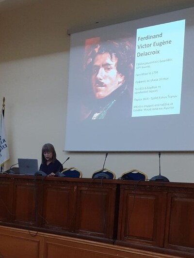 Κατόπιν, η κα Ευθαλία Κατσιγιάννη – Χάχαλη, Εικαστικός – Οικονομολόγος, παρέθεσε ομιλία με τίτλο: «Η Χίος στον καμβά του Ντελακρουά», αναλύοντας από εικαστικής και κοινωνικής απόψεως τα έργα του μεγάλου αυτού ζωγράφου σχετικά με την Επανάσταση εναντίον των Οθωμανών στην Χίο και γενικότερα στην Ελλάδα.