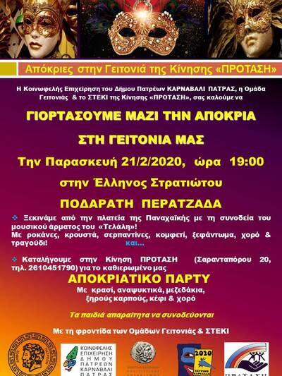 Η Ομάδα της Γειτονιάς και το Στέκι της Κίνησης «Πρόταση», στο πλαίσιο του έργου πρόληψης «Ξαναχτίζουμε τη σύγχρονη γειτονιά μας, επειδή μας αφορά», με την ευκαιρία του εορτασμού της Αποκριάς, συνδιοργανώνουν με την Κοινωφελή Επιχείρηση του Δήμου Πατρέων «Καρναβάλι Πάτρας», Αποκριάτικη Ποδαράτη Περατζάδα, την Παρασκευή 21 Φεβρουαρίου στις 19:00 από την πλατεία της Παναχαϊκής και κατά μήκος της οδού Έλληνος Στρατιώτου.