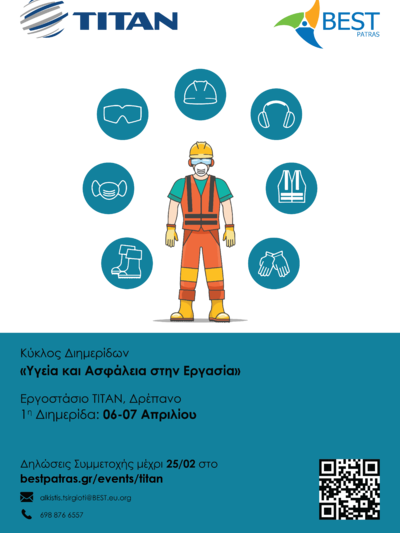 H φοιτητική ομάδα BEST Patras και ο όμιλος ΤΙΤΑΝ συνδιοργανώνουν κύκλο 3 διημερίδων με θέμα: «Υγεία και Ασφάλεια στο Χώρο Εργασίας». Στόχος αυτού του κύκλου διημερίδων, οι οποίες θα λάβουν χώρα στο εργοστάσιο του ΤΙΤΑΝ στο Δρέπανο Αχαΐας, είναι ο φοιτητής - μηχανικός να γνωρίσει βασικά ζητήματα που αφορούν την Υγεία και Ασφάλεια στην Εργασία καθώς και να έρθει σε επαφή με τις διάφορες στρατηγικές και πρακτικές που εφαρμόζονται σε ένα εργοστάσιο. Θα πληροφορηθεί για τον ρόλο του μηχανικού στην επίτευξη αποτελεσματικών μέτρων ασφαλείας και θα εξετάσει σε μακροσκοπική κλίμακα την ασφαλή λειτουργία μιας παραγωγικής μονάδας.