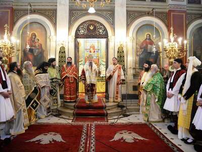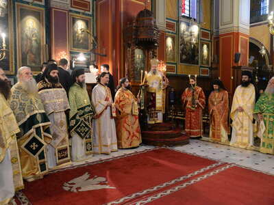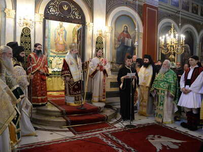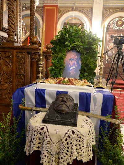 Τήν Θεία Λειτουργία καί τό ἱερό Μνημόσυνο ἐτέλεσε ὁ Σεβασμιώτατος Μητροπολίτης Πατρῶν κ.κ. Χρυσόστομος, ὁ ὁποῖος μέ λόγια συγκλονιστικά καί συγκινητικά ἀναφέρθηκε στήν λαμπρή προσωπικότητα τοῦ Γέρου τοῦ Μοριᾶ, ὁ ὁποῖος ἒφιππος χωρεῖ (προχωρεῖ) ἀνά τούς αἰῶνας δεικνύοντας στούς Λαούς πώς οἱ δούλοι γίνονται ἐλεύθεροι. (Ἐπίγραμμα στόν Ἀνδριάντα τοῦ Θεοδώρου Κολοκοτρώνη στήν Ἀθήνα).