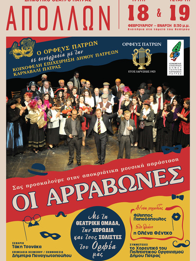 Στο πλαίσιο των εκδηλώσεων του Πατρινού Καρναβαλιού 2020 που διοργανώνει η Κοινωφελής Επιχείρηση του Δήμου Πατρέων-Καρναβάλι Πάτρας, ο ιστορικός Μουσικός Όμιλος «Ορφεύς Πατρών» θα παρουσιάσει την Τρίτη 18 και την Τετάρτη 19 Φεβρουαρίου 2020 στο Δημοτικό Θέατρο «Απόλλων» τη μουσική παράσταση «Οι Αρραβώνες», που βασίζεται στο ομώνυμο θεατρικό έργο που έγραψε ειδικά για την περίσταση ο Πατρινός συγγραφέας Τάκης Τσονάκας.