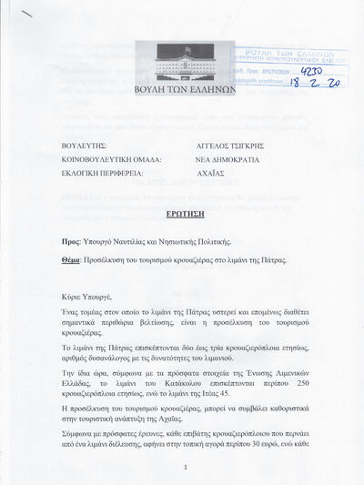 Στο πλαίσιο του κοινοβουλευτικού ελέγχου, ο βουλευτής Αχαΐας της ΝΔ Άγγελος Τσιγκρής, κατέθεσε ερώτηση προς τον Υπουργό Ναυτιλίας και Νησιωτικής Πολιτικής Ιωάννη Πλακιωτάκη σχετικά με την προσέλκυση του τουρισμού κρουαζιέρας στο λιμάνι της Πάτρας.
