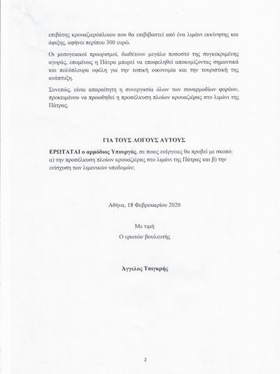 Πιο συγκεκριμένα, ο Άγγελος Τσιγκρής ρωτά τον Υπουργό Ναυτιλίας και Νησιωτικής Πολιτικής, σε ποιες ενέργειες θα προβεί με σκοπό: α) την προσέλκυση πλοίων κρουαζιέρας στο λιμάνι της Πάτρας και β) την ενίσχυση των λιμενικών υποδομών;