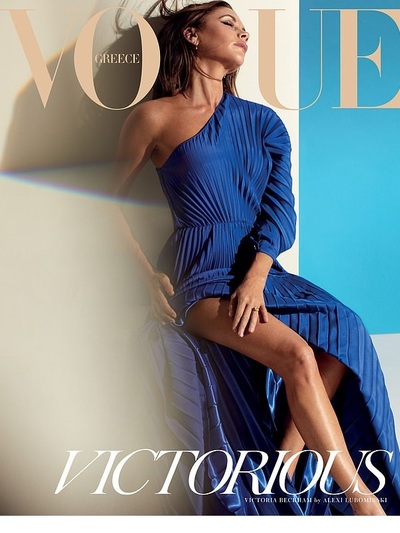 Σε ένα εξώφυλλο που «φωνάζει» ελληνικό καλοκαίρι με το φωτεινό μπλε να δεσπόζει, φιγουράρει η πολυσυζητημένη βρετανίδα designer Βικτόρια Μπέκαμ στο τεύχος του Μαρτίου της ελληνικής Vogue. Η 44χρονη πρώην ποπ σταρ, σύζυγος του σταρ της μπάλας Ντέιβιντ Μπέκαμ και μητέρα τεσσάρων παιδιών, φοράει μάλιστα ένα μονόπαντο φόρεμα σαν αρχαιοελληνικό χιτώνιο, σε πλισέ αιθέριο ύφασμα από το διεθνές label Zeus + Dione της Μαρέβας Γκραμπόβσκι- Μητσοτάκη, συζύγου του Ελληνα πρωθυπουργού. Το εξώφυλλο έχει τον υπότιτλο Victorious παραπέμποντας στο όνομα της διάσημης αγγλίδας, η οποία στις εσωτερικές σελίδες , το δέυτερο εξώφυλλο και το editorial αναδεικνύει και τα δικά της ρούχα από το ομώνυμο fashion brand. Η ελληνική Vogue από τη στιγμή που ξανακυκλοφόρισε είναι η πρώτη φορά που επιλέγει γυναίκα που δεν είναι μοντέλο ως βασικό της πρόσωπο. Η φωτογράφιση υπογράφεται από τον Alexi Lubomirski. H ίδια η Βικτόρια έγραψε στο διαδίκτυο «Λάτρεψα το γεγονός ότι φόρεσα αυτό το όμορφο φόρεμα από το Ελληνικό label Zeus + Dione για το τεύχος Μαρτίου της Vogue Greece, φιλάκια»