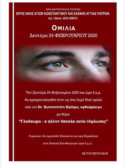 Αυτή τη Δευτέρα 24 Φεβρουαρίου 2020 στις 6 το απόγευμα πρόκειται να πραγματοποιηθεί στον ιερό ναό Αγίων Κωνσταντίνου και Ελένης Αγυιάς Πατρών μία ενδιαφέρουσα, όπως αναμένεται ομιλία από τον συμπολίτη Dr. Κωνσταντίνο Καϊάφα Οφθαλμίατρο με θέμα «Γλαύκωμα, η πλέον ύπουλη αιτία τύφλωσης». Θα προηγηθεί εσπερινός και ιερά παράκληση στην Παναγία Ελευθερώτρια, ώρα 5 το απόγευμα.