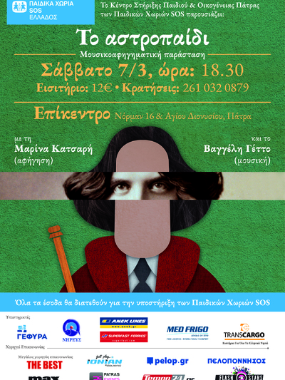 Το Κέντρο Στήριξης Παιδιού και Οικογένειας των Παιδικών Χωριών SOS παρουσιάζει το Αστροπαίδι του Oscar Wilde σε μια μουσικοαφηγηματική παράσταση, το Σάββατο 7 Μαρτίου και ώρα 18:30, στο Θέατρο Επίκεντρο+ στην Νόρμαν και Αγ. Διονυσίου, στην Πάτρα.